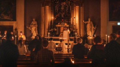 Lezingendienst, doop en zalving van nieuwe gelovigen en eucharistieviering. Van donker naar licht, van dood naar leven. >>